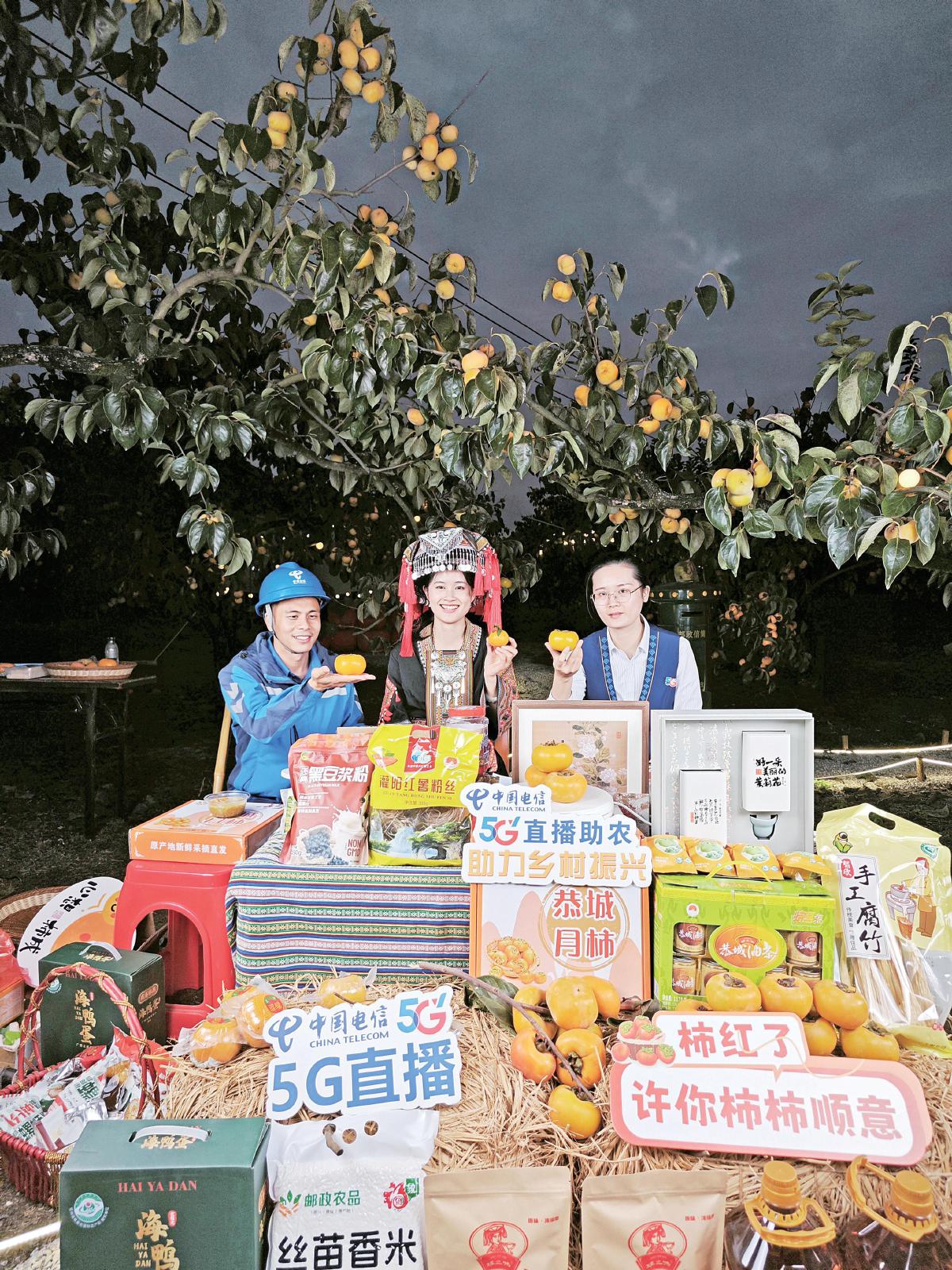 “家人们晚上好呀!这颗恭城月柿清甜多汁、果肉饱满,忙碌一天后啃上一口,满是清甜慰藉。”金秋时节,广西桂林恭城瑶乡硕果满枝。身着瑶族服饰的主播在直播间热情吆喝。镜头里,金黄的月柿挂满枝头,满满都是丰收的喜人景致。这场由广西恭城分公司携手中国邮政共同打造的5G助农直播,正通过高速稳定的5G网络,把瑶乡特色送到千家万户。 蓝艳芸/摄