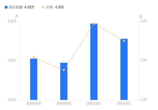 4月17日消息,数据显示,截至2026年3月31日,A股股东总户数为4.56万户,较上期(2025年12月31日)减少3872户,降幅7.83%。公司最新A股总股本为16.71亿股,其中流通A股16.71亿股,户均持有流通A股数量为3.67万股,较上期增加2873.55股,增幅8.50%;户均持流通A股市值14.67万元,较上期增加4056.44元,增幅2.84%。