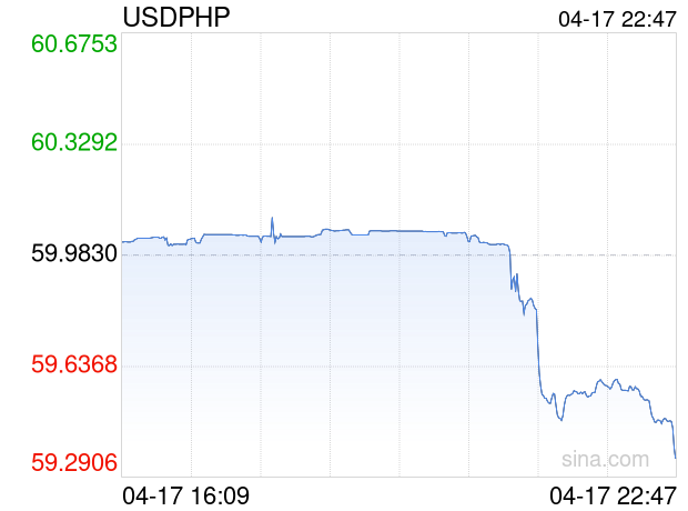 新浪外汇消息2026年04月17日,截至22时47分,外汇市场上美元兑汇率跌破1美元兑换59.3560菲律宾比索。跌幅为-1.0453%
