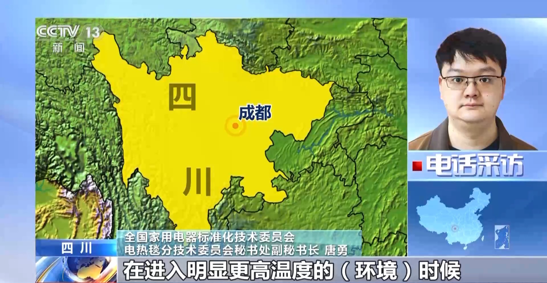 全国家用电器标准化技术委员会 电热毯分技术委员会秘书处副秘书长 唐勇:目前的发热片主要有碳基膜,包括碳纤维膜、石墨烯膜还有一种是金属膜,还有普通的金属发热丝,碳基膜它的特点就是加热速度会比较快,金属膜和金属加热丝的发热量稳定,但是有一个缺点就是不抗弯折,揉搓和弯折有可能导致它直接损坏。