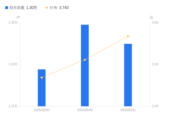 4月18日消息,数据显示,截至2026年3月31日,A股股东总户数为1.3万户,较上期(2025年9月30日)减少457户,降幅3.40%。公司最新A股总股本为7.15亿股,其中流通A股7.15亿股,户均持有流通A股数量为5.51万股,较上期增加1909.56股,增幅3.59%;户均持流通A股市值20.59万元,较上期增加3.11万元,增幅17.76%。