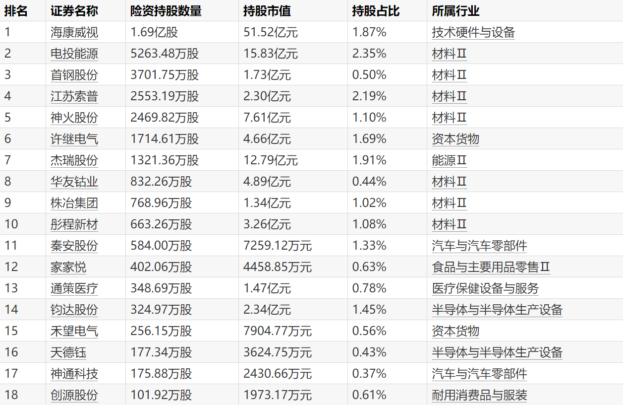 从行业分布看,险资一季度持仓高度集中于材料领域。统计显示,18只重仓股中,材料行业个股多达7只,涵盖金属冶炼、化工、新能源材料等细分赛道。其中,、、等企业因业绩稳健或行业景气度提升,获得险资加仓。半导体与半导体生产设备、汽车与汽车零部件行业紧随其后,各有2只个股入选,显示险资对高端制造领域的长期布局意图。