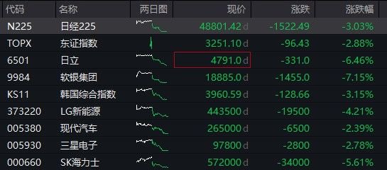 亚太主要股指收盘普跌,日经225指数、韩国综合指数均跌超3%,AI及半导体概念股领跌,软银集团跌逾7%,日立跌近7%,SK海力士跌近6%。