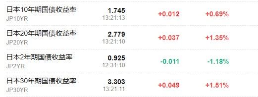 同时,日元、日债亦下跌:日元兑美元跌至155.37,创下1月以来新低;兑欧元汇率跌破180,为1999年欧元诞生以来的最弱水平。日本10年期、20年期和30年期国债收益率纷纷上涨,其中10年期国债收益率升至1.754%,是2008年6月以来的最高水平。