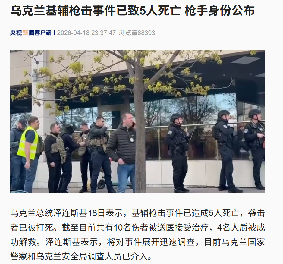 乌克兰总统泽连斯基18日表示,基辅枪击事件已造成5人死亡,袭击者已被打死。截至目前共有10名伤者被送医接受治疗,4名人质被成功解救。泽连斯基表示,将对事件展开迅速调查,目前乌克兰国家警察和乌克兰安全局调查人员已介入。