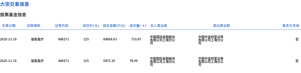 11月19日,大宗交易成交789.86万股,成交额9.87亿元,占当日总成交额的69.42%,成交价125元,较市场收盘价131.11元折价4.66%。