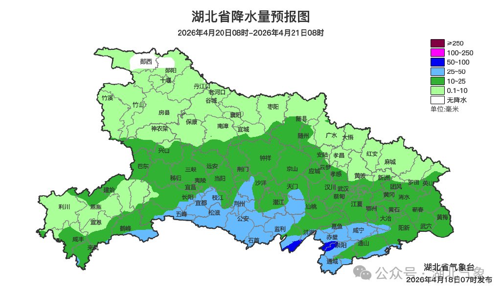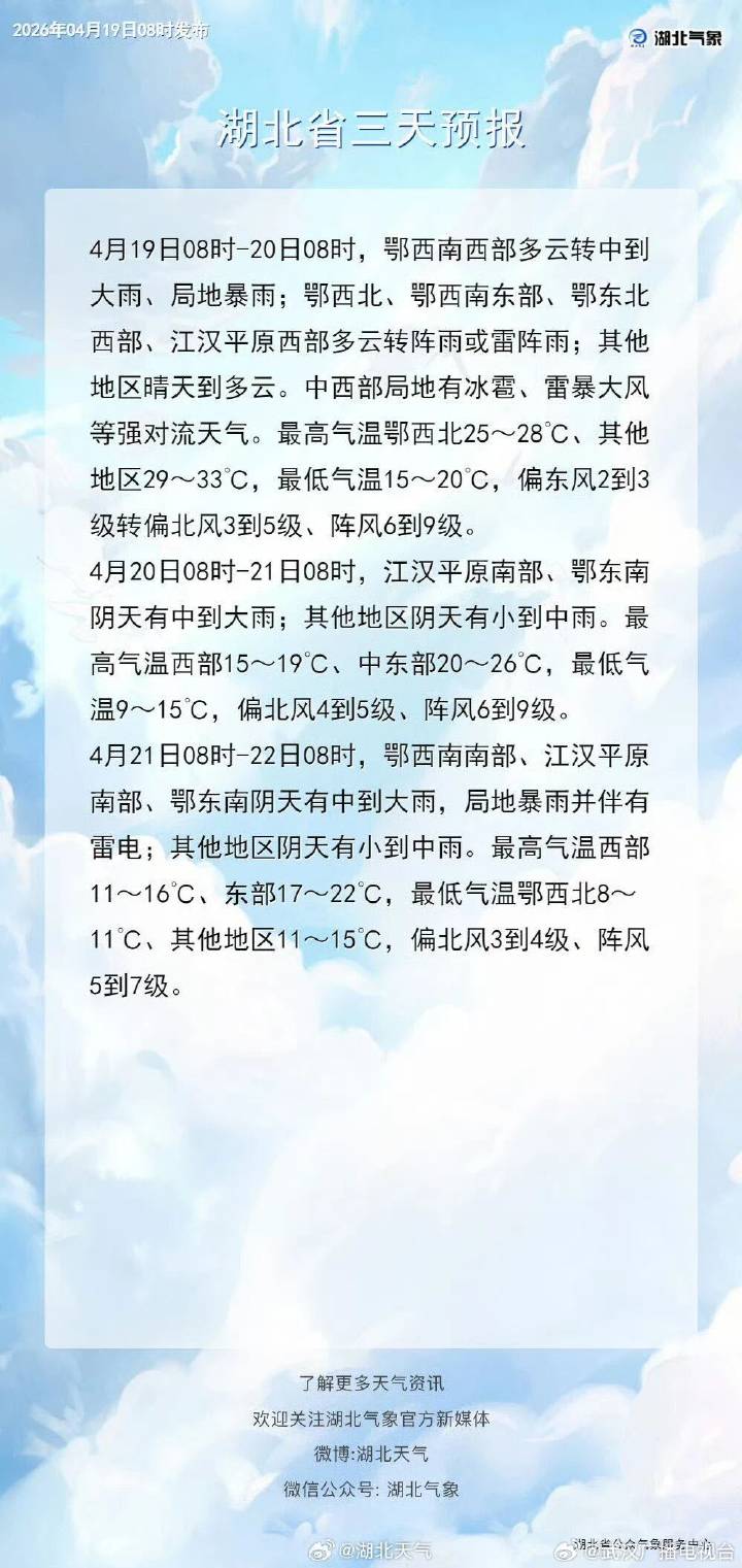 具体来看:今天夜间,恩施、宜昌等地将率先转雨,有中到大雨,局地暴雨;明天(20日)南部中到大雨,局地暴雨伴有雷电,北部小到中雨,明天最高气温西部降至15~19℃,中东部20~26℃。