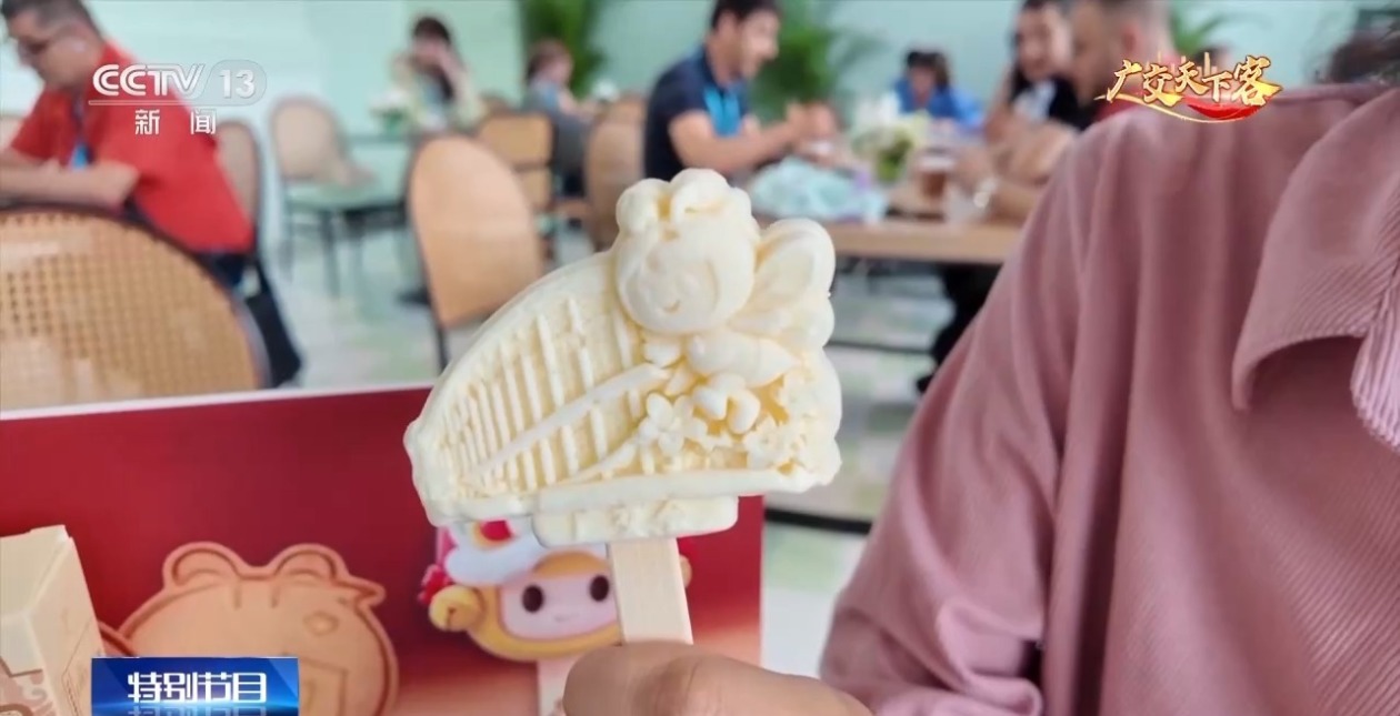 总台记者 朱解语:新品文创雪糕造型采用的是广交会展馆的元素,结合了好宝、好妮的萌趣形象,还点缀了广东特色的木棉花。逛展累了来一口,真是清甜又解暑。新品文创巧克力,它不仅和我们的吉祥物造型相融合,还创造性地运用了广东醒狮的元素。