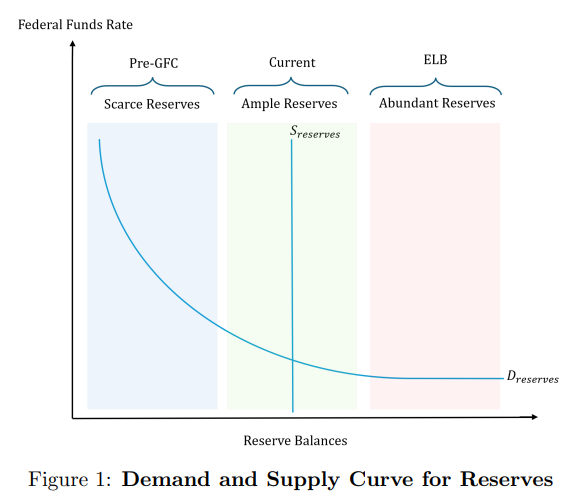 传统框架认为,联储缩表的约束来自“准备金供给触及需求曲线陡峭区间”——一旦供给收紧至临界点,隔夜利率就会失控。因此,联储只能等准备金降至“稀缺”状态后被动停止缩表。2019年9月的“回购市场地震”,正是这一逻辑的现实演绎。