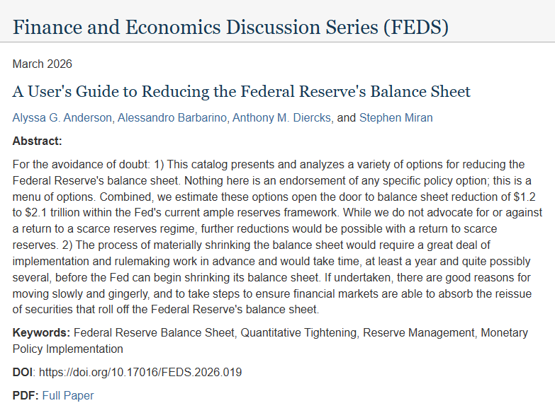 理解这篇论文,不能脱离联储人事背景。市场普遍预期,沃什将接任美联储主席。沃什长期以来对QE以来的联储扩表政策持批评态度,曾多次公开表达缩减资产负债表的政策偏好。