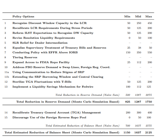 允许有效联邦基金利率(EFFR)高于IORB,即打破当前EFFR长期低于IORB的状态。论文援引Lopez-Salido与Vissing-Jorgensen(2025)框架估算,若以“EFFR-IORB = +2bp”为参考(接近2019年9月压力水平),对应准备金需求下降区间为1500亿至5500亿美元。