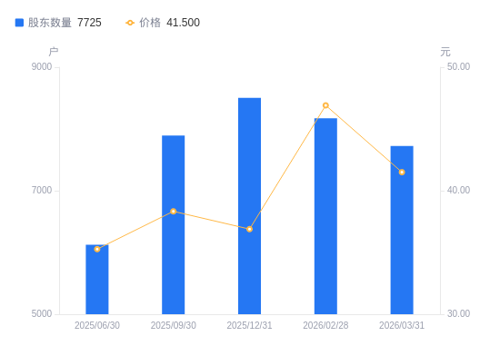 4月20日消息,数据显示,截至2026年3月31日,A股股东总户数为7725户,较上期(2026年2月28日)减少449户,降幅5.49%。公司最新A股总股本为1.94亿股,其中流通A股1.86亿股,户均持有流通A股数量为2.41万股,较上期增加1322股,增幅5.81%;户均持流通A股市值99.88万元,较上期减少6.82万元,降幅6.39%。