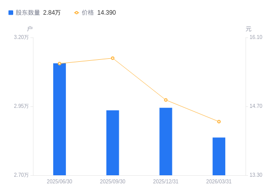 4月20日消息,数据显示,截至2025年12月31日,A股股东总户数为2.95万户,较上期(2025年9月30日)增加92户,增幅0.31%。公司最新A股总股本为3.37亿股,其中流通A股2.18亿股,户均持有流通A股数量为7408.03股,较上期减少23.21股,降幅0.31%;户均持流通A股市值10.99万元,较上期减少6660.82元,降幅5.72%。