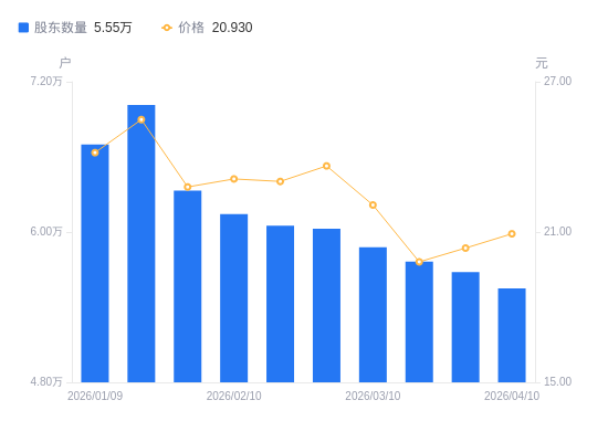 4月20日消息,数据显示,截至2026年3月31日,A股股东总户数为5.68万户,较上期(2026年3月20日)减少819户,降幅1.42%。公司最新A股总股本为3.35亿股,其中流通A股2.88亿股,户均持有流通A股数量为5070.76股,较上期增加72.06股,增幅1.44%;户均持流通A股市值10.32万元,较上期增加4216.47元,增幅4.26%。