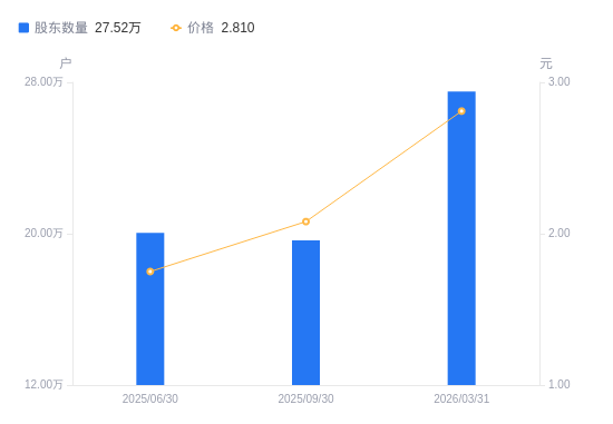 4月20日消息,数据显示,截至2026年3月31日,A股股东总户数为27.52万户,较上期(2025年9月30日)增加7.87万户,增幅40.04%。公司最新A股总股本为88.32亿股,其中流通A股88.32亿股,户均持有流通A股数量为3.21万股,较上期减少1.28万股,降幅28.59%;户均持流通A股市值9.02万元,较上期减少3297.07元,降幅3.53%。