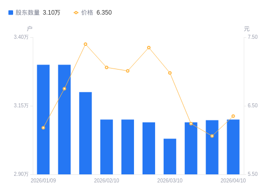 4月20日消息,数据显示,截至2026年4月10日,A股股东总户数为3.1万户,较上期(2026年3月31日)增加26户,增幅0.08%。公司最新A股总股本为11.62亿股,其中流通A股10.57亿股,户均持有流通A股数量为3.41万股,较上期减少28.62股,降幅0.08%;户均持流通A股市值21.65万元,较上期增加9713.11元,增幅4.70%。