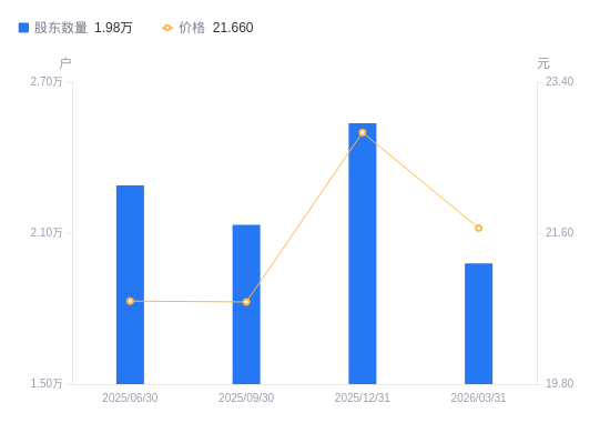 4月21日消息,数据显示,截至2025年12月31日,A股股东总户数为2.54万户,较上期(2025年9月30日)增加4047户,增幅18.98%。公司最新A股总股本为2.24亿股,其中流通A股1.28亿股,户均持有流通A股数量为5049.8股,较上期减少958.29股,降幅15.95%;户均持流通A股市值11.51万元,较上期减少9712.71元,降幅7.78%。