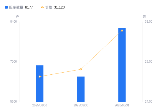 4月21日消息,数据显示,截至2026年3月31日,A股股东总户数为8177户,较上期(2025年9月30日)增加1696户,增幅26.17%。公司最新A股总股本为8948万股,其中流通A股4605.87万股,户均持有流通A股数量为5632.71股,较上期减少1474.01股,降幅20.74%;户均持流通A股市值17.53万元,较上期减少1.83万元,降幅9.45%。