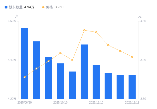 12月30日消息,数据显示,截至2025年12月19日,A股股东总户数为4.94万户,较上期(2025年11月30日)增加35户,增幅0.07%。公司最新A股总股本为14.17亿股,其中流通A股14.12亿股,户均持有流通A股数量为2.86万股,较上期减少20.28股,降幅0.07%;户均持流通A股市值11.29万元,较上期减少2654.92元,降幅2.30%。