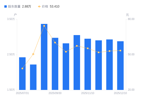 12月30日消息,数据显示,截至2025年12月19日,A股股东总户数为2.82万户,较上期(2025年12月10日)减少523户,降幅1.82%。公司最新A股总股本为2.83亿股,其中流通A股8456.9万股,户均持有流通A股数量为2994.55股,较上期增加54.45股,增幅1.85%;户均持流通A股市值15.07万元,较上期减少6285.19元,降幅4.00%。