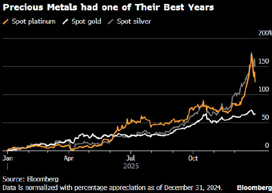 黄金和白银在2025年最后一个交易日下跌,但两者仍势将创下年度纪录涨幅,成就贵金属的出色之年。