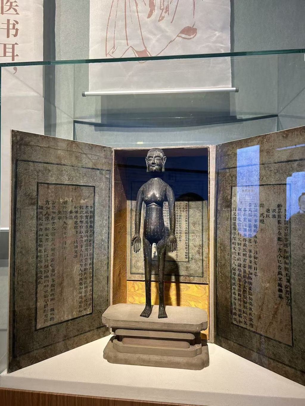 御制针灸铜人 上海中医药博物馆 藏 铜人全身刻有14条经脉循行路线及580个未标注穴位名的小圆孔。此铜人是乾隆帝为褒奖编纂《医宗金鉴》的有功之臣,于乾隆九年(1744 年)御制的针灸铜人之一。