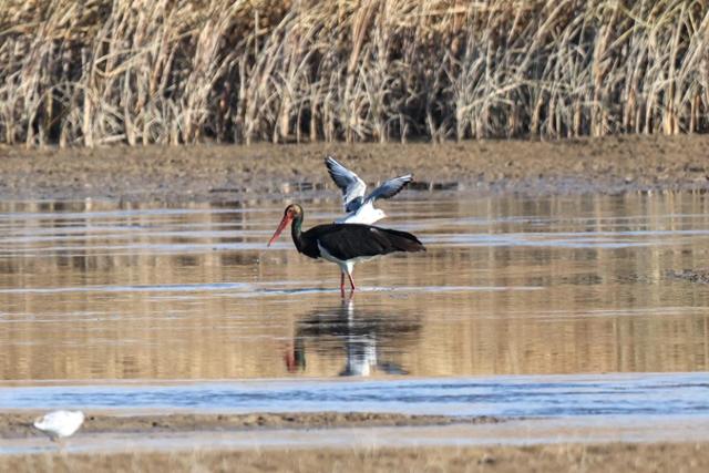 11月12日,在河西走廊中部的张掖黑河湿地国家级自然保护区高台段,国家一级保护野生动物黑鹳在一处湿地浅滩觅食。新华社记者 郎兵兵 摄