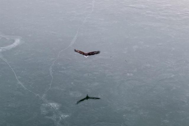 11月22日,在河西走廊东端的甘肃民勤石羊河国家湿地公园,国家一级保护野生动物白尾海雕在红崖山水库翱翔(无人机照片)。新华社记者 郎兵兵 摄