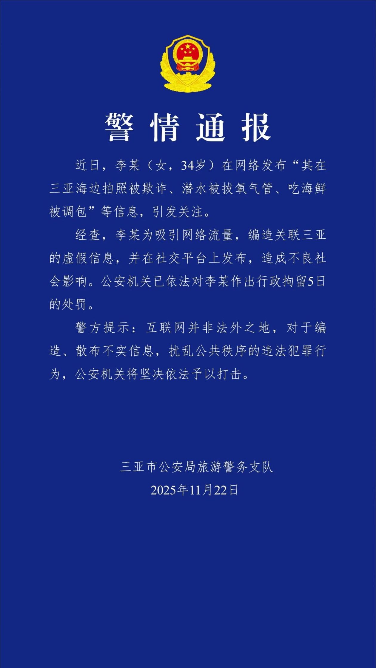 11月22日,三亚市公安局旅游警务支队发布警情通报: