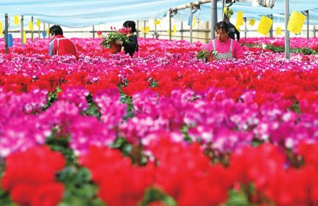 日前,在河北省石家庄市栾城区农林高科技园区花卉基地,20万株各类花卉娇艳绽放,花农们精心挑选并打包发货,供应市场。