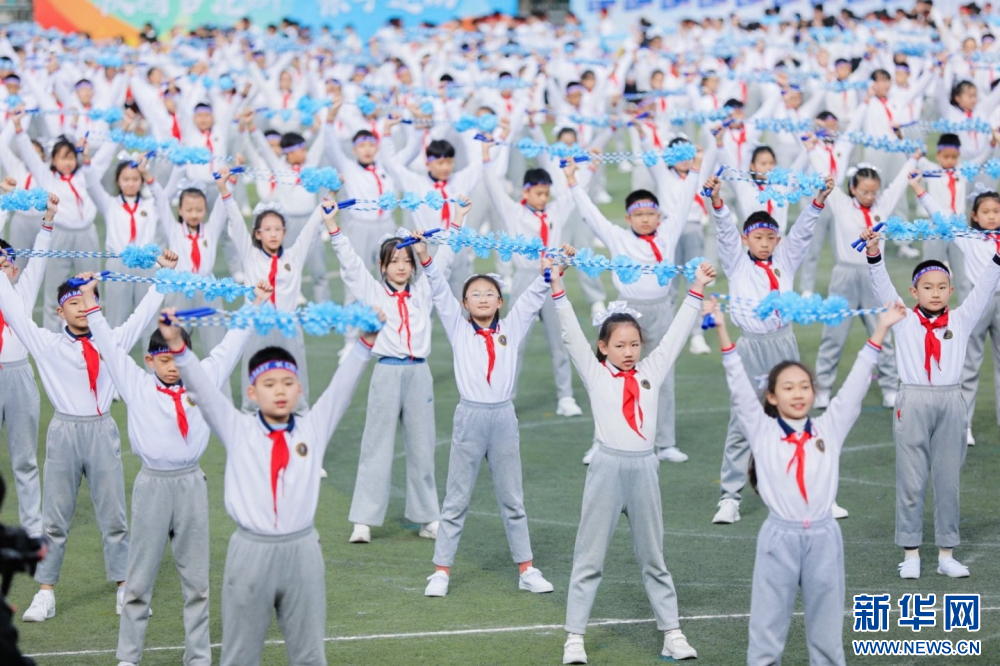 小学部展演方阵(11月22日摄)。开幕式上,高中部“重器巡礼”科技方阵、初中部敏捷训练操方阵、小学部体育特色方阵、教师方阵与警校家护学岗方阵的展演精彩纷呈。大课间展演中,啦啦操、跳绳、龙拳、民族韵律操等特色表演轮番登场。