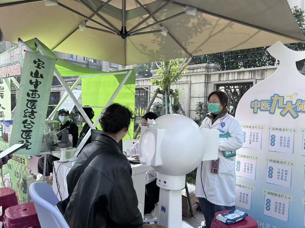 市集以“便民惠民”为核心,将专业中医服务转化为居民触手可及的生活体验。曙光医院、宝山区中西医结合医院等多家医疗机构的专家坐镇咨询区,针对颈肩腰腿痛、失眠、消化不适等常见问题提供一对一解答;基础检测区免费提供血压、血糖测量和体质辨识服务,耳穴贴压、艾灸贴DIY等适宜技术体验区前排起长队;八段锦现场教学环节更是人气爆棚,老祖宗传下来的养生功法成为打工人“去班味”的实用妙招。