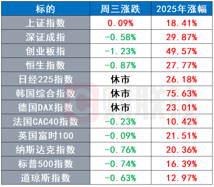 从全年表现来看,美股三大指数均实现两位数百分比的涨幅(事实上全球主要股指都达到这一水平),最后几日的萎靡还险些让纳指丢掉了“连续3年涨幅均超20%”的成就。就2025年的表现而言,亚洲科技股毫无疑问是最耀眼的群体,坐拥两大存储巨头的韩国综指全年暴涨75%,中国创业板指也交出了接近50%的涨幅。