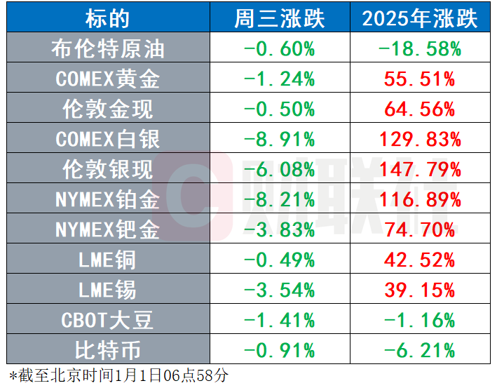 大宗商品方面,2025年毫无疑问是金属大年,即便在年末遭遇芝商所的连续调控后,现货白银的全年涨幅依然达到147%。黄金、铂金、钯金亦有强力表现。相对而言,原油不仅录得连续第三年下跌,也是2020年后的最大年度跌幅。年内一度冲上12万美元关口的比特币今年最后3个月突然失去动力,最终悉数回吐年内涨幅。