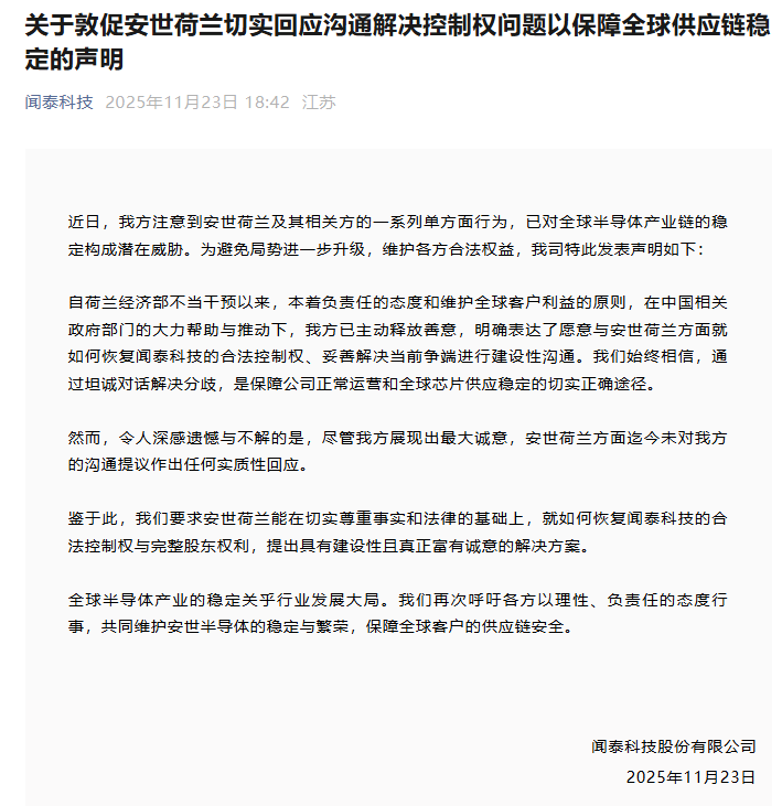 近日,我方注意到安世荷兰及其相关方的一系列单方面行为,已对全球半导体产业链的稳定构成潜在威胁。为避免局势进一步升级,维护各方合法权益,我司特此发表声明如下: