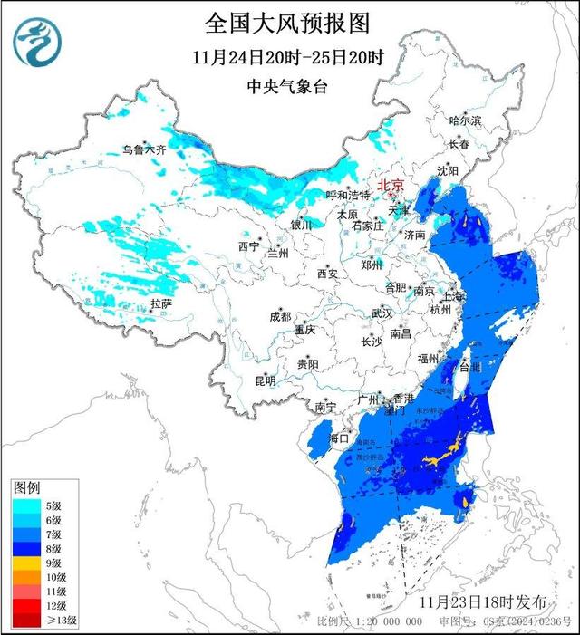 预计,11月23日20时至24日20时,新疆东部、内蒙古中西部、西北地区中东部、华北等地部分地区有5~7级大风、阵风8~9级,黄淮大部、江汉中东部等地部分地区有5~6级大风、局地阵风7~8级;渤海、渤海海峡、巴士海峡、南海东北部偏南海域和中部海域将有7~8级、阵风9~10级的大风。
