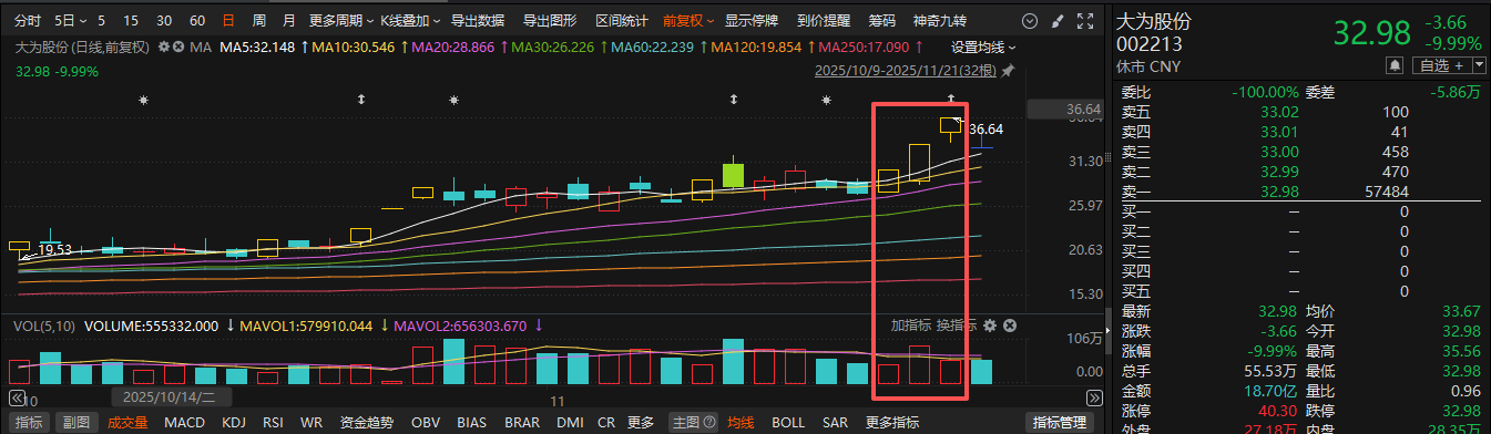 二级市场上,大为股份周四收盘斩获三连板。