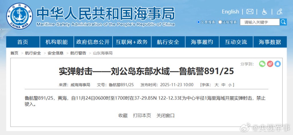 据中国海事局网站消息,威海海事局发布航行警告,11月24日6时至17时,黄海部分海域开展实弹射击,禁止驶入。