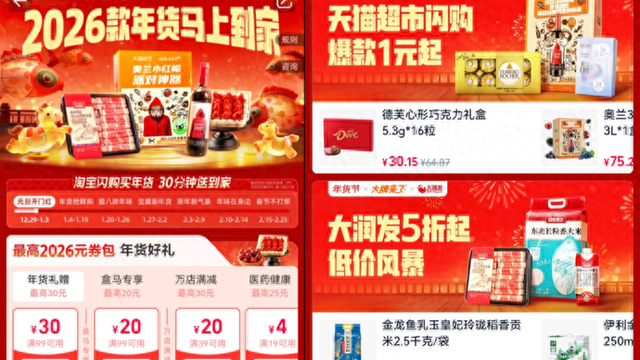 据悉,活动期间,用户搜索“年货节”进入会场,可领取最高2026元的券包,用户领券下单可享受多档满减优惠,覆盖百货、超市、酒水、生鲜等全品类商家。
