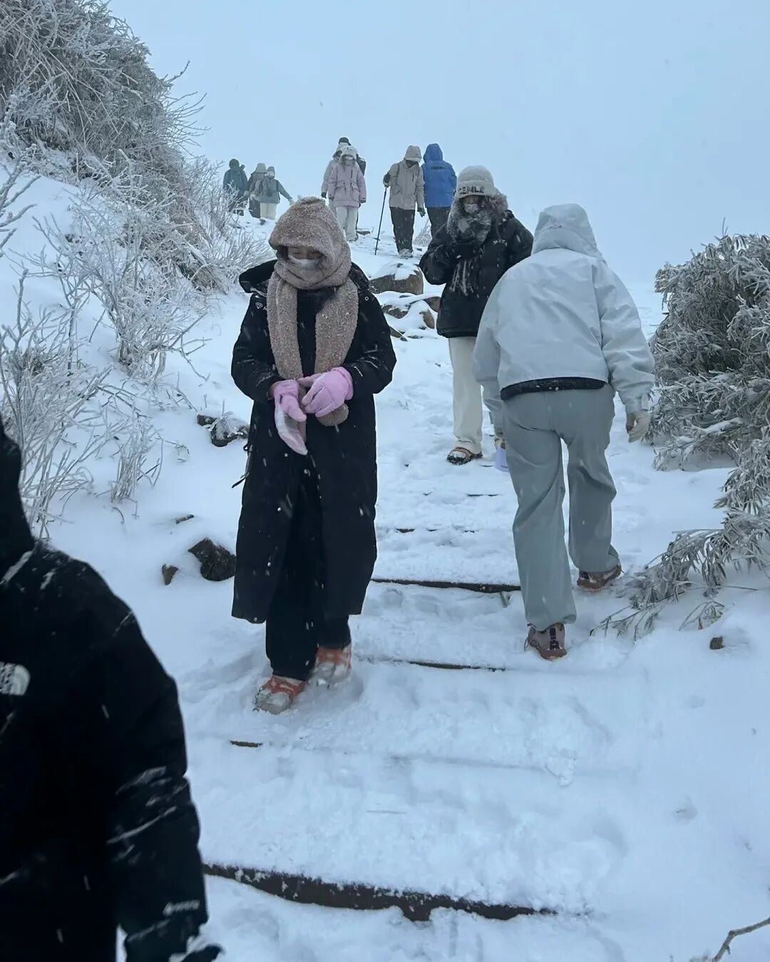 临安太子尖大家冒着雪在山中徒步。网友隽阜供图