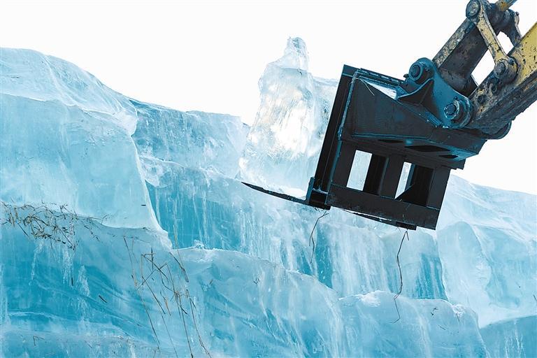 超过10万立方米的存冰将被陆续运往验冰场,经过专业人员的严格检验后,被运送至哈尔滨冰雪大世界园区用于冰建景观建造。新华社记者 谢剑飞 摄