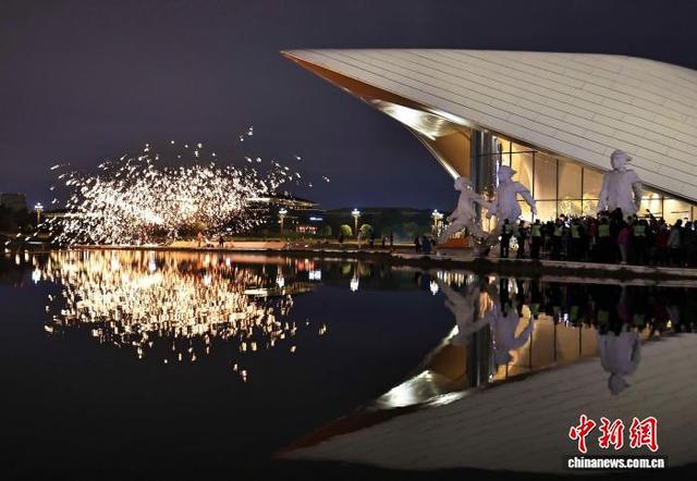 12月31日晚,许多市民和游客在成都市天府艺术公园观看“打铁花”表演,欢度跨年夜。图为艺人表演“打铁花”。中新社记者 王磊 摄