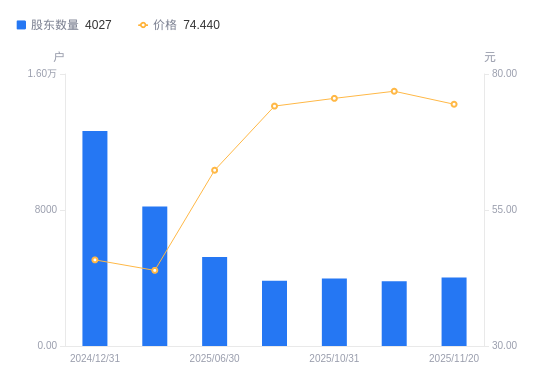 11月25日消息,数据显示,截至2025年10月31日,A股股东总户数为3967户,较上期(2025年9月30日)增加124户,增幅3.23%。公司最新A股总股本为1.02亿股,其中流通A股3081.68万股,户均持有流通A股数量为7768.28股,较上期减少250.65股,降幅3.13%;户均持流通A股市值58.67万元,较上期减少7542.57元,降幅1.27%。
