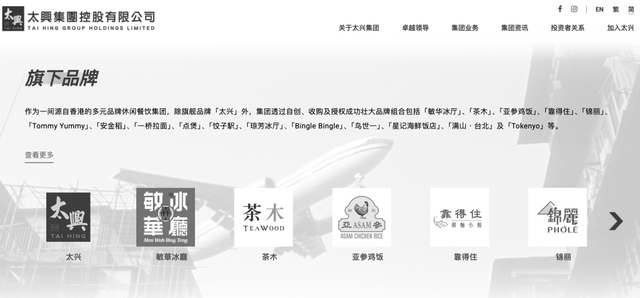 目前集团旗下有“太兴”“敏华冰厅”“茶木”“亚参鸡饭”“靠得住”等18个餐饮品牌,餐厅数量超210间,遍布香港、中国内地和澳门。