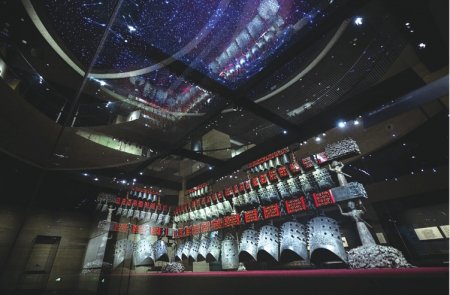 来到湖北省博物馆的曾侯乙展厅,若定睛细看曾侯乙编钟底层正中的镈(bó)钟,它器形巨大,口缘与其余编钟形制不一。这件镈钟是楚惠王熊章为曾侯乙专门制作的一件仪礼重器。