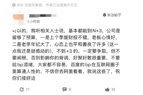 此外,在百度同事圈也有消息称:“听相关人士说,基本都能到N+3,公司是留够了预算,一是上个季度财报不错,老板心情好,二是老李年纪大了,心态上也平和善良了许多(这一点我还是挺感动的),不到+3的,一定要争取,但不要闹掰,否则影响你的背调,好聚好散很重要,不要给bp添堵,大家都不容易,百度的bp在互联网圈子里算通人性的”。