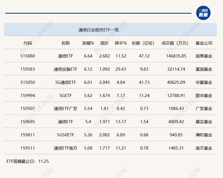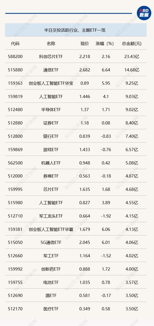 ETF涨幅榜上,随着再创新高,创业板人工智能和通信两类ETF大涨,包括通信ETF(515880)在内6只相关ETF半日涨幅超6%,表现抢眼。
