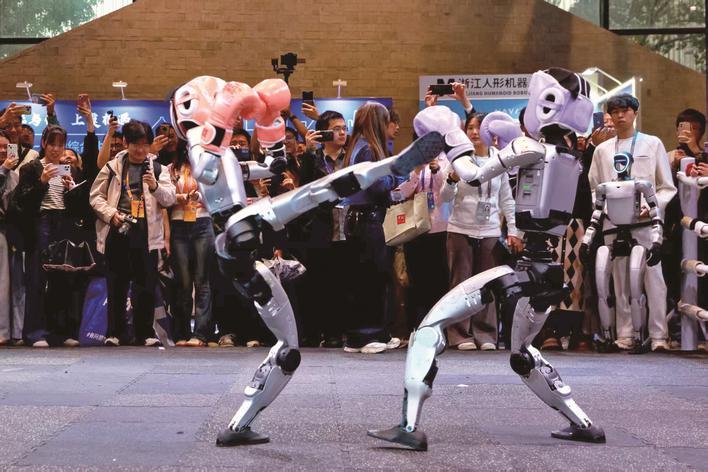 人形擂台赛 作者:周丽琴 作者自述:人形机器人擂台赛火药味十足,这场高科技“互搏”让现场观众目不暇接,惊叹连连。 点评:两个机器人摆出拳击与踢腿的动态姿势,机械感中透着可爱,打破了“机器人很冰冷”的刻板印象。“科技感+趣味性”的碰撞,让画面互动感十足。