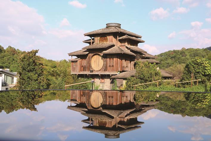 汤屋 作者:夏天琦 点评:这幅照片的倒影效果特别有吸引力,既放大景致之美,更添了几分空灵诗意。作者巧用玻璃反射,完美复刻建筑与天空,将画面打造成对称的“上下镜像”;前景镜面、中景建筑、背景山林层次分明,像一幅静谧的山水画卷。
