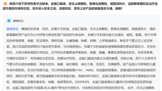此外,公司还回复称,全国流感活动显著增强,已进入快速上升期。公司在抗感染和呼吸领域的核心产品,在流感季节需求有显著增长;面对此波流行,公司正在积极应对市场需求变化,加紧排产来满足日益增长需求。并表示随着金振口服液儿童流感新适应症的拓展,公司呼吸疾病产品线的市场空间有望进一步打开,预计将为业绩增长提供持续动力。